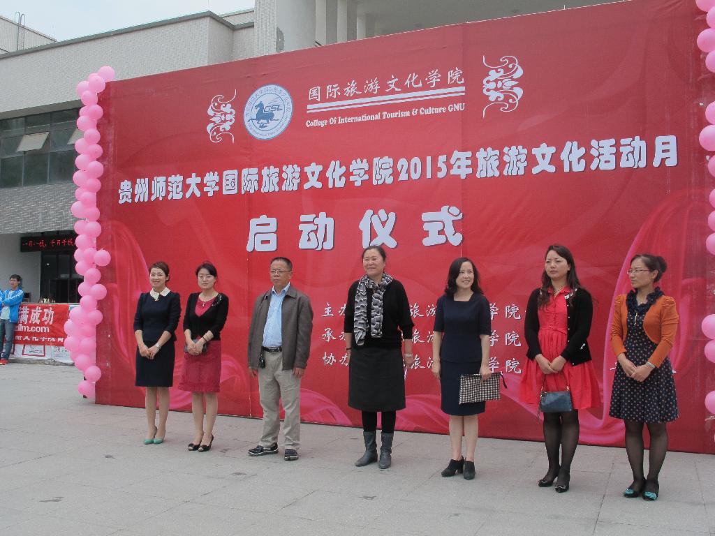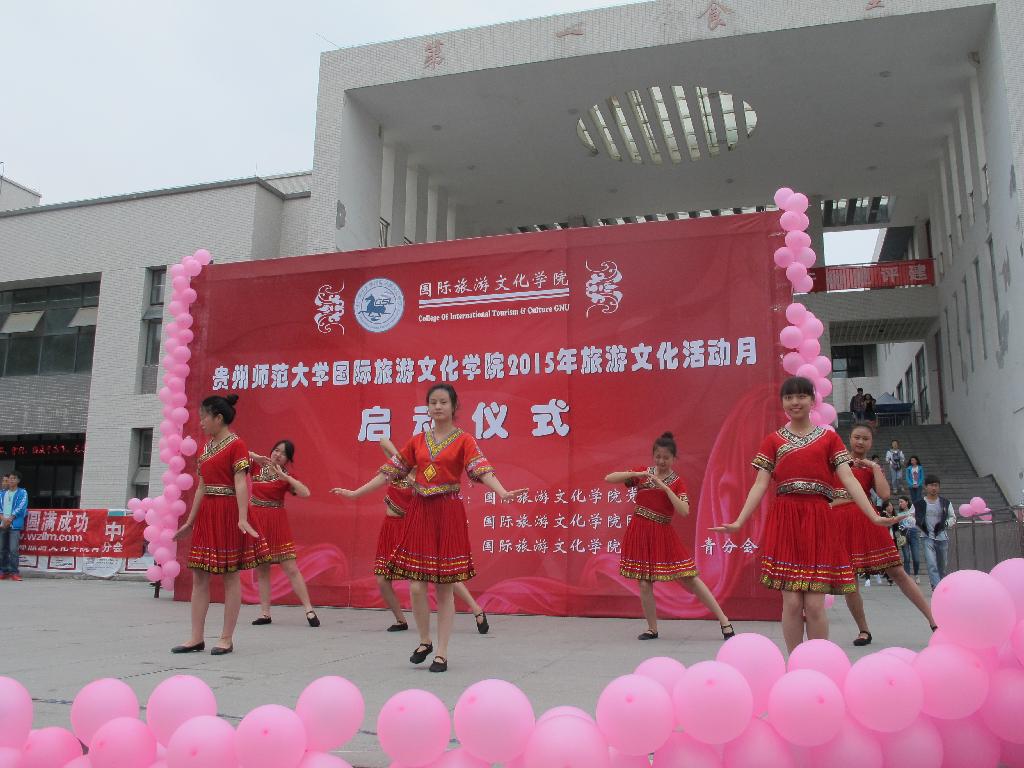 5月13日中午,由国际旅游文化学院党总支主办的“旅游文化活动月”启动仪式在花溪校区一食堂广场举行。校党委宣传部部长黄保红、学工部副部长张丽、团委副书记姚作舟、国旅学院党政班子、师生代表出席了仪式。仪式由学院党总支副书记梅应贤主持。