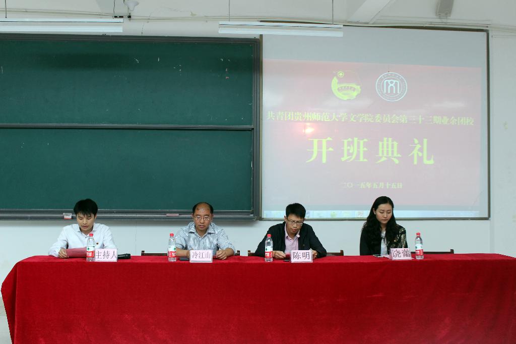 5月15日下午,文学院在花溪校区GJ6301举行第三十三期业余团校开班典礼。文学院党委副书记陈明、校团委办公室主任饶蕾、文学院副教授冷江山出席开班典礼,开班典礼由文学院团委书记杨定主持。文学院各级辅导员以及85名学员到场。