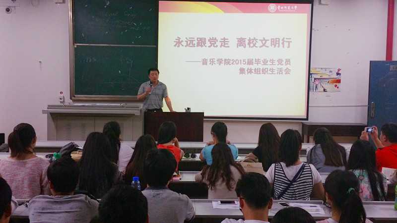 5月19日下午,音乐学院在学院6-5教室举行了“为母校增光·为党旗添彩”2015届毕业生党员大会暨毕业生党员集体组织生活会。学院党委副书记刘海、党委秘书秦晓青、办公室副主任李中静及毕业班辅导员舒谦、刘春健出席会议。全体研究生、本科生毕业生党员,低年级党支部书记和党员代表参会。会议由党委组织员潘瑜主持。