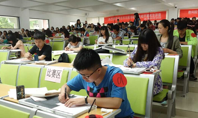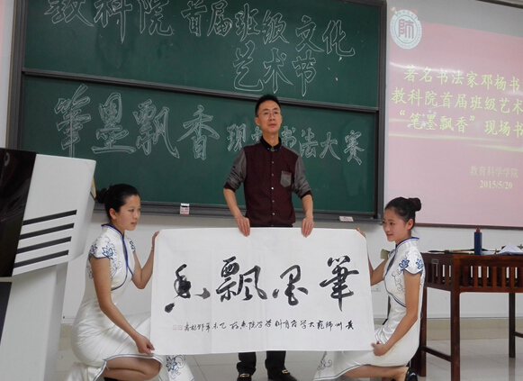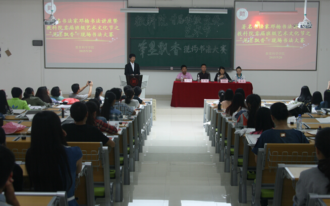 为推进班级行为文明建设,促进学生基本教学技能成长,营造良好的院风、班风和学风,5月20日中午,教育科学学院在GJ6302教室举办了著名书法家邓杨书法讲座暨教科院首届班级文化艺术节之“笔墨飘香”现场书法大赛。教育科学学院党委书记杨建原,副书记罗洪刚,中国书法家协会会员、贵州省著名书法家邓杨,小学教育专业教师黄河,全体辅导员以及各年级共200余名学生参加活动。