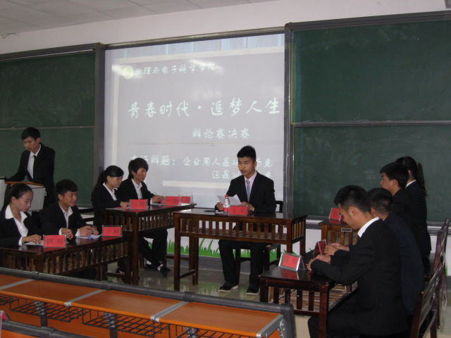 5月22日下午,物理与电子科学学院“青春时代·追梦人生”辩论赛总决赛于物理楼1521教室举行。院团委副书记吴培、2012级辅导员魏佳妮、院学生会副主席胡山豪担任评委。经过初赛,进入决赛的是2013级物理学一班与2014级通用技术班。