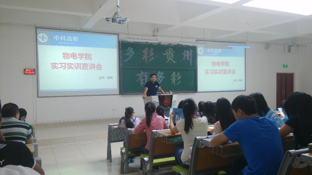 为进一步做好实习实训工作,6月9日,物理与电子科学学院在花溪校区GJ6302教室举行2012级学生实习实训宣讲会。中科高教科技公司、海信集团(贵州分公司)、国信安信息产业基地有限公司等三家企业到场宣讲,学院团委副书记吴培主持。学院200余名即将进行实习实训的2012级学生当场聆听。