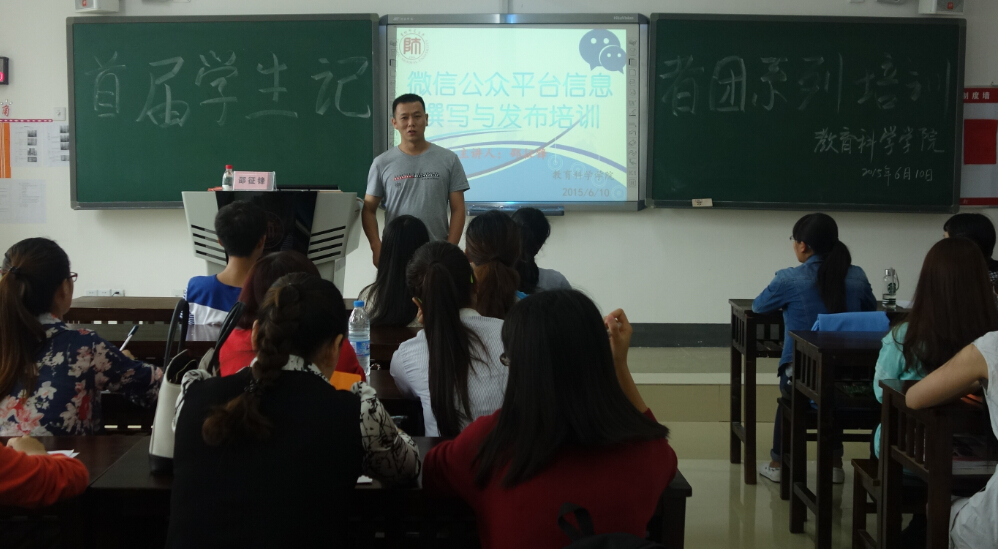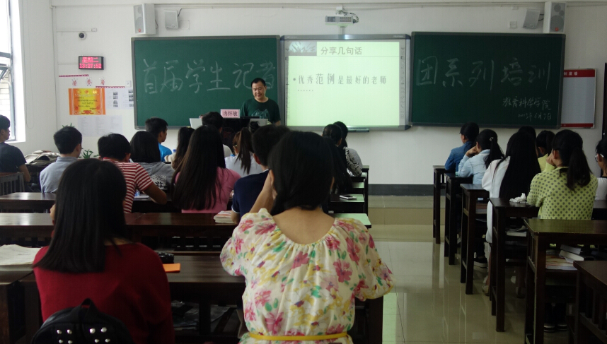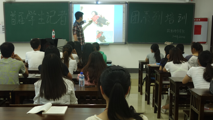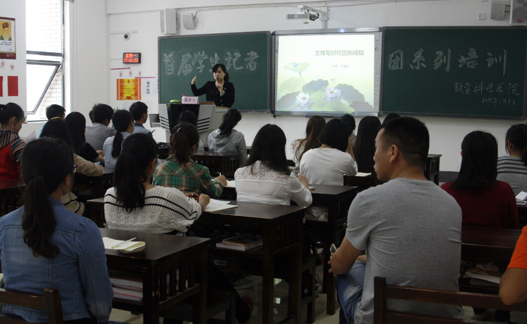 为加强教育科学学院宣传阵地建设,组建一支强有力的宣传报道队伍,及时有效的对外发布学院各种活动信息,提升学院宣传报道工作的效率及质量。根据学院领导相关安排部署,教育科学学院于6月8--10日花溪校区文科楼2211教室开展了首届学生记者团系列培训讲座。此次系列培训讲座共计四场,分别邀请了院党委组织员吴嘉佳、教育技术学专业教师冉怀敏、2014级辅导员邵征锋、校宣传部居天奕同学担任主讲嘉宾。团委学生会通讯部、信息技术部成员及全体报名参加学生记者团招募的同学,共计50余人到场聆听。