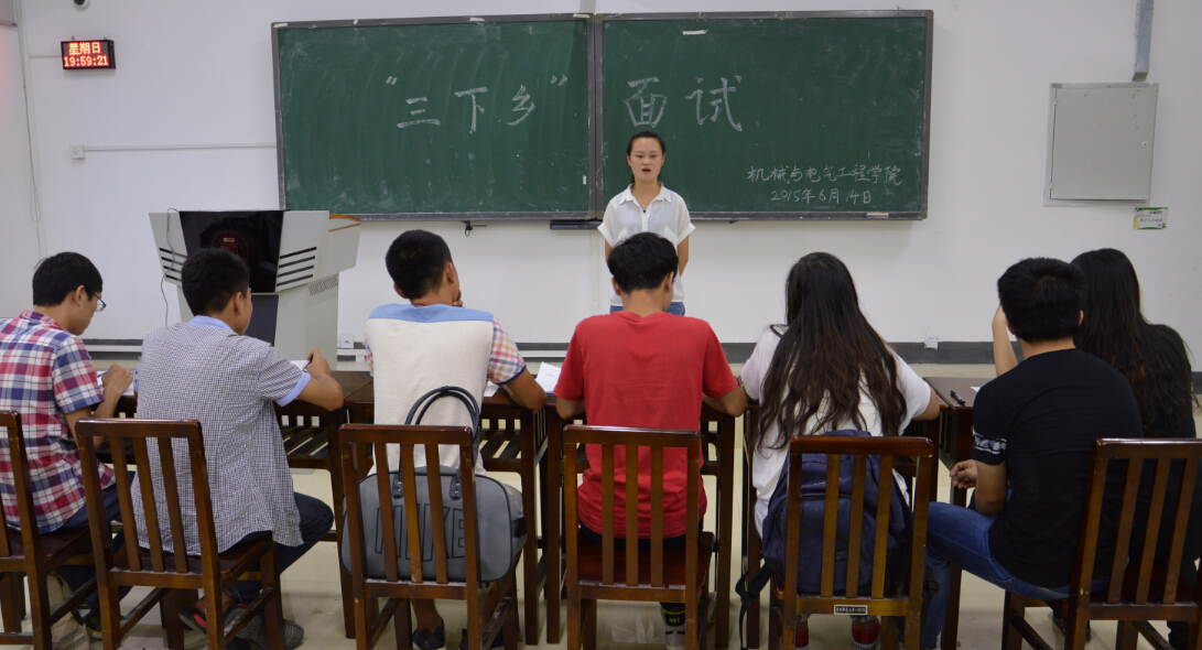 根据《机械与电气工程学院2015年暑期“三下乡”社会实践活动实施方案》的工作部署,切实做好“三下乡”社会实践活动准备工作,选拔优秀队员,经过前期宣传、班级报名,机电学院于6月11日—6月16日开展了暑期“三下乡”社会实践队队员选拔活动,2012级、2013级、2014级各班学生踊跃参与,学院团委副书记许珊,辅导员廖文群,学生会、青分会各部门负责人对报名者进行了面试选拔。