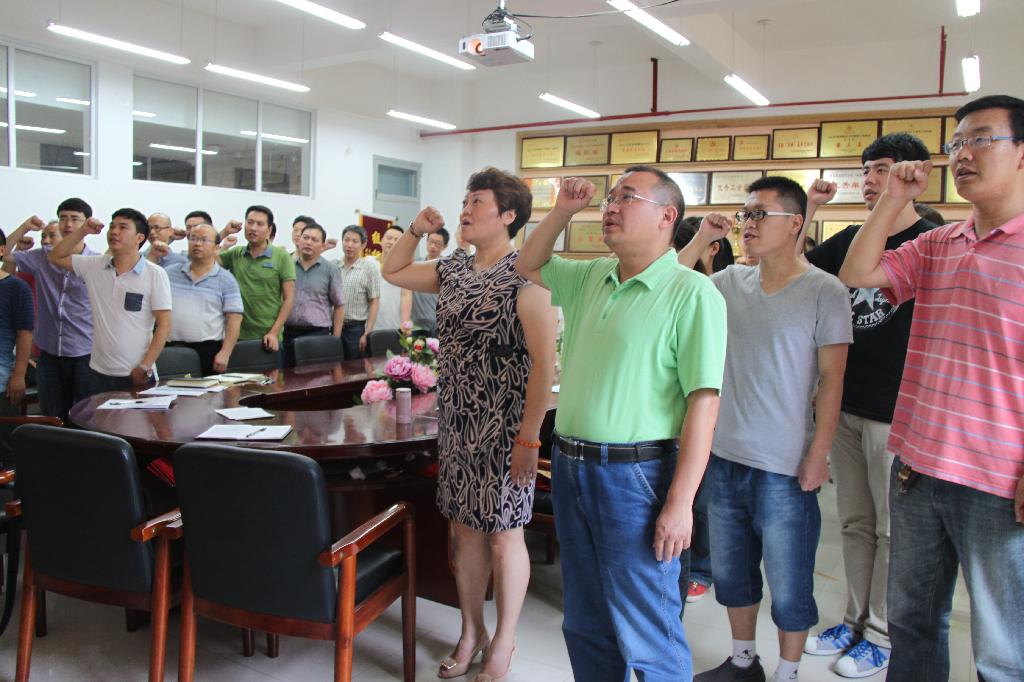 马克思主义学院响应校党委号召,积极开展中国共产党建党94周年系列活动。6月26日下午,学院全体党员教师及学生在学院会议室开展了新党员宣誓、老党员重温入党誓词活动。党总支书记杨文武领誓,全体党员教师及学生面对党旗庄严宣誓。