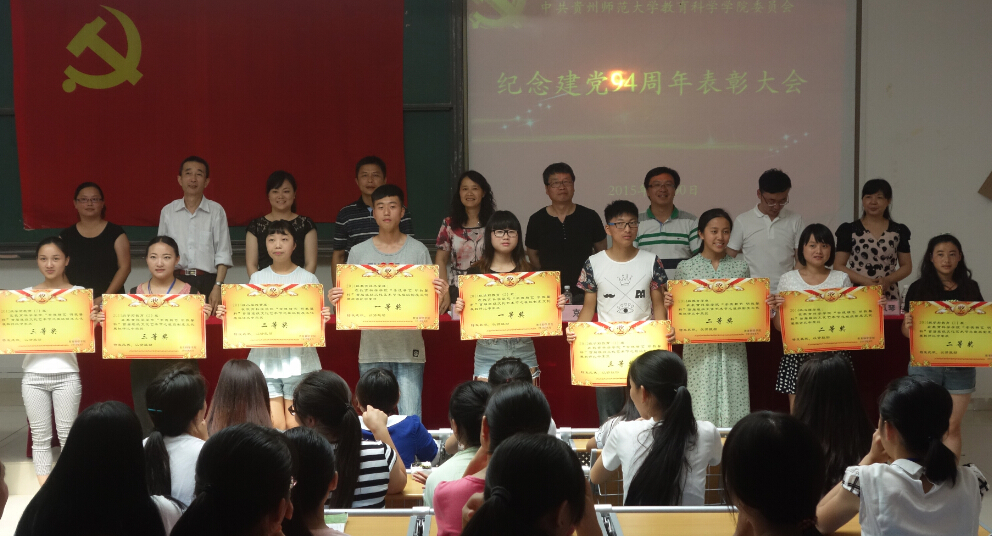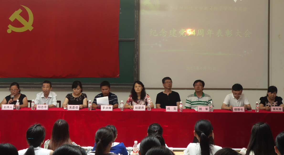 为回顾党的光辉历程,激励广大党员牢记职责使命,更好地发挥党员的先锋带头模范作用。6月30日,教育科学学院于花溪校区GJ6301教室召开了纪念建党94周年表彰大会。学院党委书记杨建原,副书记罗洪刚,副院长何克、刘军、穆陟晅,党委组织员吴嘉佳,党委委员郑志平,党委委员教育学教工党支部书记袁凤琴,心理学教工党支部书记植凤英,行政党支部书记伍岳以及学生党总支委员、学生党支部书记、各年级辅导员,全体学生党员及各班级学生代表共计300余人参与此次大会。大会由学院党委秘书杜吉娴主持。