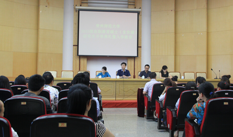 7月10日上午,贵州师范大学2015级在职教育硕士研究生开学典礼暨入学教育仪式在宝山校区田家炳书院三楼多能厅举行。研究生院院长梁虹、副院长汪勇、罗筱霖、研究生院科室负责人、研究生班主任及300余名在职教育硕士新生参加了开学典礼。典礼由汪勇主持。