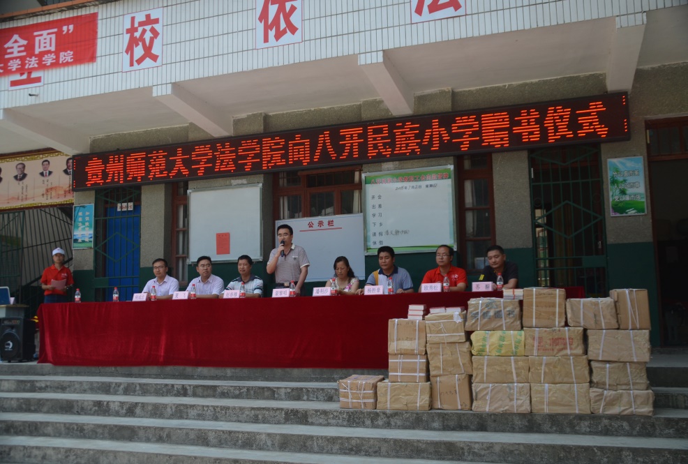 7月21日中午,法学院在学院暑期“三下乡”社会实践服务地——贵州省榕江县八开乡民族小学举行图书捐赠活动,意在为该校留守儿童送去关爱和帮助。法学院党委书记蒙黎明,省妇联儿童部部长潘利沙、省妇联驻八开乡干部夏飞,榕江县八开乡党委副书记赵春穆,榕江县八开乡民族小学校长杨胜豪,法学院办公室主任苏醒,法学院团委书记欧秀松、副书记何成忠等出席。