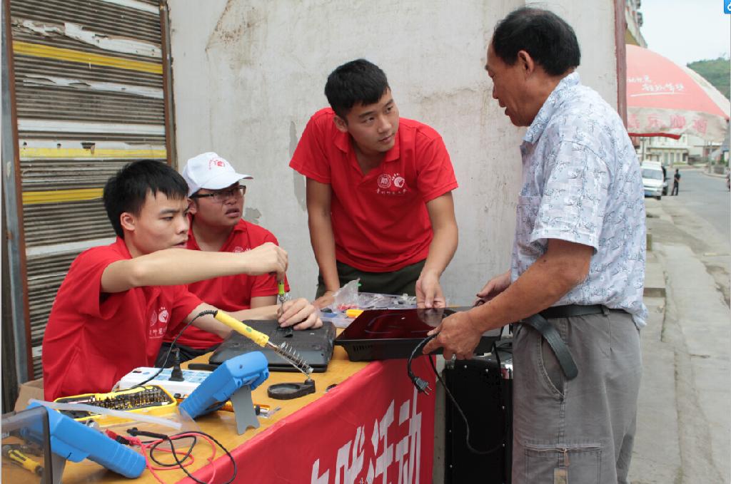 义务家电维修组在枫香中学门口设置维修点免费为当地乡亲维修电磁炉、电饭锅、电吹风、电风扇、电水壶等小型家电,以及电脑故障排除和重装系统。