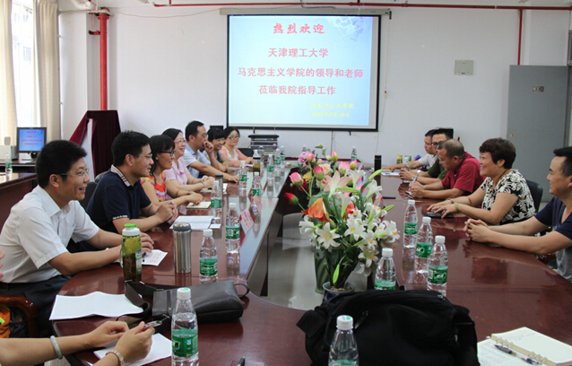 7月20日下午,天津理工大学法政学院党委书记张冬梅、院长马用浩一行20位老师来我校马克思主义学院进行交流、考察,并参加教育部全国高校思想政治理论课教师社会实践研修基地(贵州师范大学)的实践研修培训活动。我校马克思主义学院总支书记杨文武、院长欧阳恩良、教育部全国高校思想政治理论课教师社会实践研修基地(贵州师范大学)办公室副主任陈晓娟以及各学科主任和部分教师代表参加了座谈和讨论。双方互相介绍了各自学校、院部的情况,并对思想政治理论课教师如何提升思想政治理论课教学改革的水平、如何提升思想政治理论课教师教学科研能力、以及如何构建马克思主义理论学科平台与教学平台建设、如何运用慕课等先进手段来进行教学等问题进行了深入的交流和讨论。交流座谈会从下午3点一直持续到6点,气氛热烈。