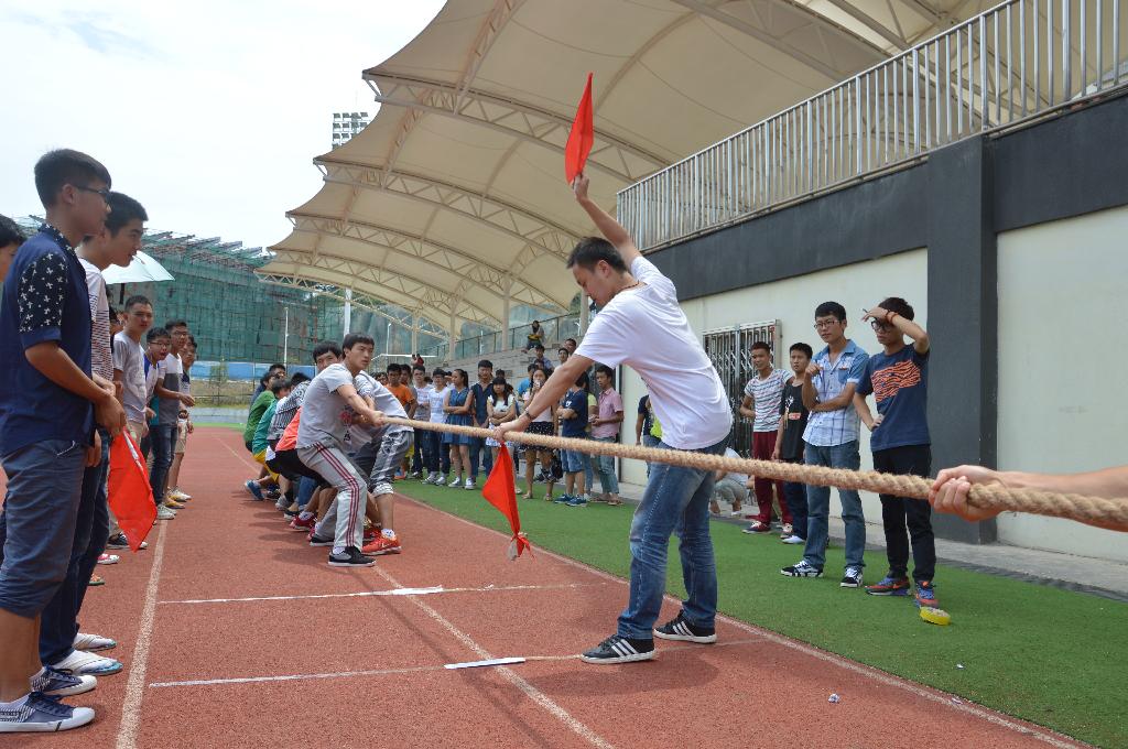 当比赛的哨声一响起,队员们一起高呼着“一二,一二”, 双手紧握长绳,憋足了劲拼命往后拉,辅导员也在呐喊、助阵加油。赛场上,号子声、呐喊声,此起彼伏,飘荡在整个田径场上空。经过激烈的耐力、体力角逐,最终2014级机械(2)班勇夺冠军,2014级电气班获得亚军,2013级电气(3)班取得第三名。