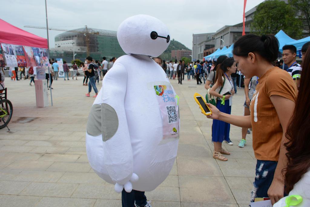 “带你变萌带你飞,我不是胖嘟嘟只是气很足”。体型胖胖造型呆萌的一只大棉花糖般“治愈系”机器人大白造型,成了整个迎新场地上地环学院新生报到点的醒目标志。为了方便新生熟悉报到流程、顺利完成报到注册,了解学校其他机构地点和校园路线,及时查看学院的通知安排等,院团委学生会别出心裁地制作了大白造型,并在大白肚子上精心设计了二维码,新生只要通过扫描二维码这一简单的动作,就可以关注“地环印象”这一微信平台,及时了解以上信息。志愿者们还将继续在“地欢印象”微信平台上传精心准备的文章和收罗的信息,其内容几乎涉及了大学生活的方方面面,进一步帮助新同学解决这一阶段遇到的实际困难。