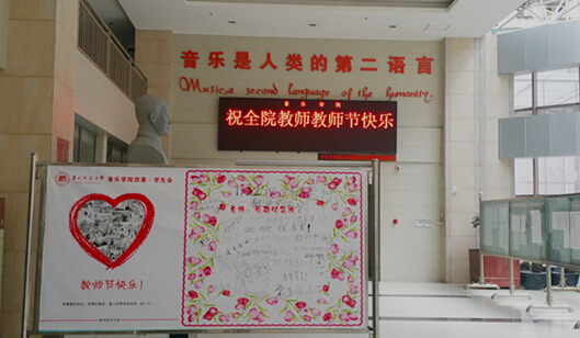送上一句教师节祝福语。教师节当天,音乐学院一楼液晶显示屏滚动播放“祝全院教师节日快乐”的祝福语;学院工会通过手机短信、学院教师QQ群等方式向全院教师送去节日祝福;院团委学生会在学院一楼门厅设置“老师,我想对您说”留言板,组织同学为老师献上祝福箴言。