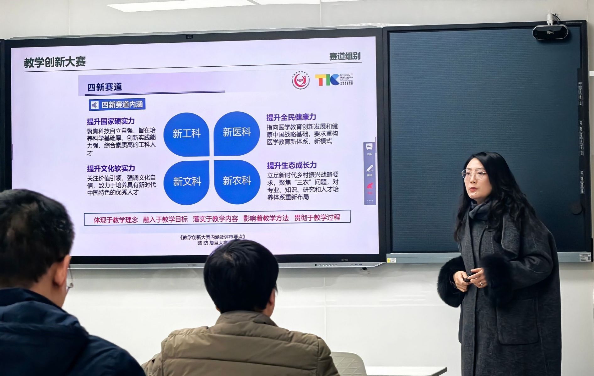 熊媛结合2019年以来参加各类教学竞赛的丰富经验,系统梳理了教师教学创新大赛的整体情况与发展趋势,全方位分享了备战教学创新大赛的实战经验。她重点围绕备赛过程中的几个核心命题——政策导向、学生需求、育人目标进行深入剖析。她讲到,厘清这些核心问题是精准选择赛道、有效凝练特色、实现教学内容与方法突破的关键。此外,她还就教学创新成果报告撰写、创新汇报设计、汇报演练等具体备赛环节分享了宝贵的实战经验。