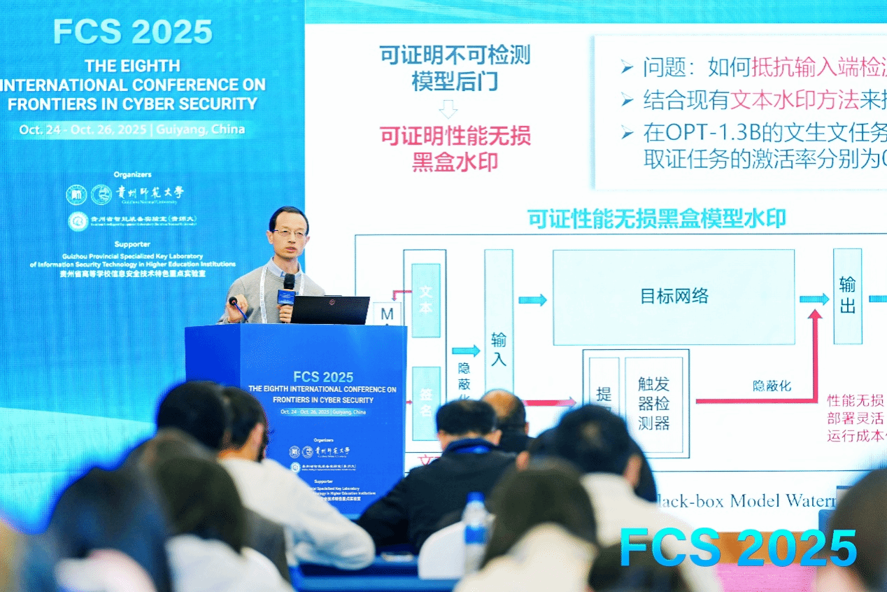 来自多所高校的专家学者作了大会报告,分享了最新研究成果。四川大学陈兴蜀教授阐述了网络空间威胁权威可测数据集的研究成果;华侨大学田晖教授深入探讨了VoIP流中的人工智能驱动隐蔽通信与检测技术;中国科学技术大学张卫明教授聚焦AIGC和AI模型的水印技术研究;清华大学罗平教授分享了基于大模型的公钥密码分析方法;中国科学院大学翟立东教授介绍了面向下一代数字基础设施的主动安全验证平台“TianzhuOS”;西藏大学董志诚教授提出了高原环境下的分布式GPU计算架构优化方案。我校大数据与计算机科学学院网络空间安全学科负责人暨本次大会的技术委员会主席陈延利进行了总结发言。
