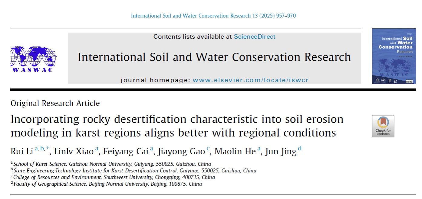 近日,我校喀斯特研究院李瑞研究员团队在世界水土保持学会会刊《International Soil and Water Conservation Research》(中科院一区TOP, IF=7.3)在线发表了题为“Incorporating rocky desertification characteristic into soil erosion modeling in karst regions aligns better with regional conditions”的研究论文。该项研究在野外长期原位观测的基础上,建立了石漠化特征与土壤侵蚀之间的数量关系,进一步地构建了石漠化因子(D)。将D因子引入RUSLE模型,从而发展了RUSLE-D模型。最后,基于多个喀斯特流域长系列高频泥沙观测信号,对RUSLE-D模型的性能进行了系统评价。