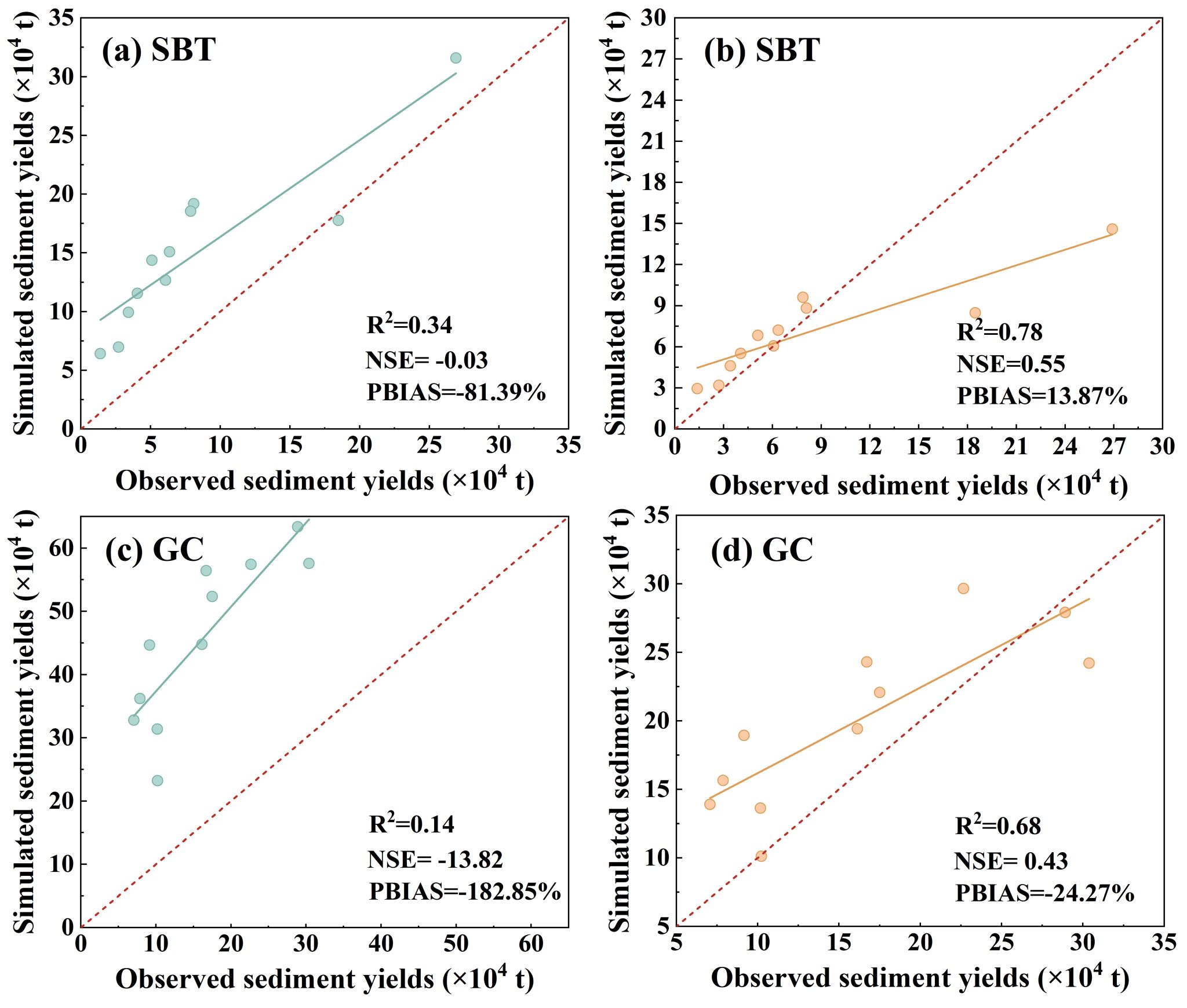 该研究提出用D因子来表征喀斯特地表特征对土壤侵蚀的影响,并将其与土壤流失的关系纳入RUSLE模型中,建立RUSLE-D模型。基于典型喀斯特集水区长系列沉积物观测信号,对RUSLE和RUSLE-D模型的性能进行比较,以验证RUSLE-D模型在喀斯特地区的适用性。结果发现,天然降雨条件下,土壤侵蚀与D之间呈负指数关系。RUSLE-D模型估算的石板塘(SBT)集水区与高车(GC)集水区的多年平均土壤侵蚀率分别为8.99和14.63t ha-1yr-1。SBT集水区RUSLE模型和RUSLE-D模型的R2分别为0.34和0.78、NSE分别为-0.03和0.55、PBIAS分别为-81.39%和13.87%;GC集水区RUSLE模型和RUSLE-D模型的R2分别为0.14和0.68、NSE分别为-13.82和0.43、PBIAS分别为-182.85%和-24.27%。SBT集水区和GC集水区的MCI指数分别为0.56和0.96。这表明,RUSLE-D在模拟喀斯特流域土壤侵蚀的准确性得到了显著提高。