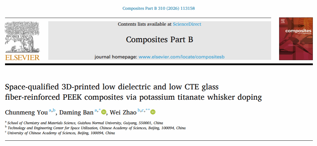 近日,我校化学与材料科学学院班大明教授团队在复合材料工程领域TOP期刊《Composites Part B: Engineering》(中科院SCI一区,IF=14.2)在线发表一篇题为“Space-Qualifed 3D-Printed Low Dielectric and Low CTE Glass Fiber-Reinforced PEEK Composites via Potassium Titanate Whisker Doping”的研究论文。