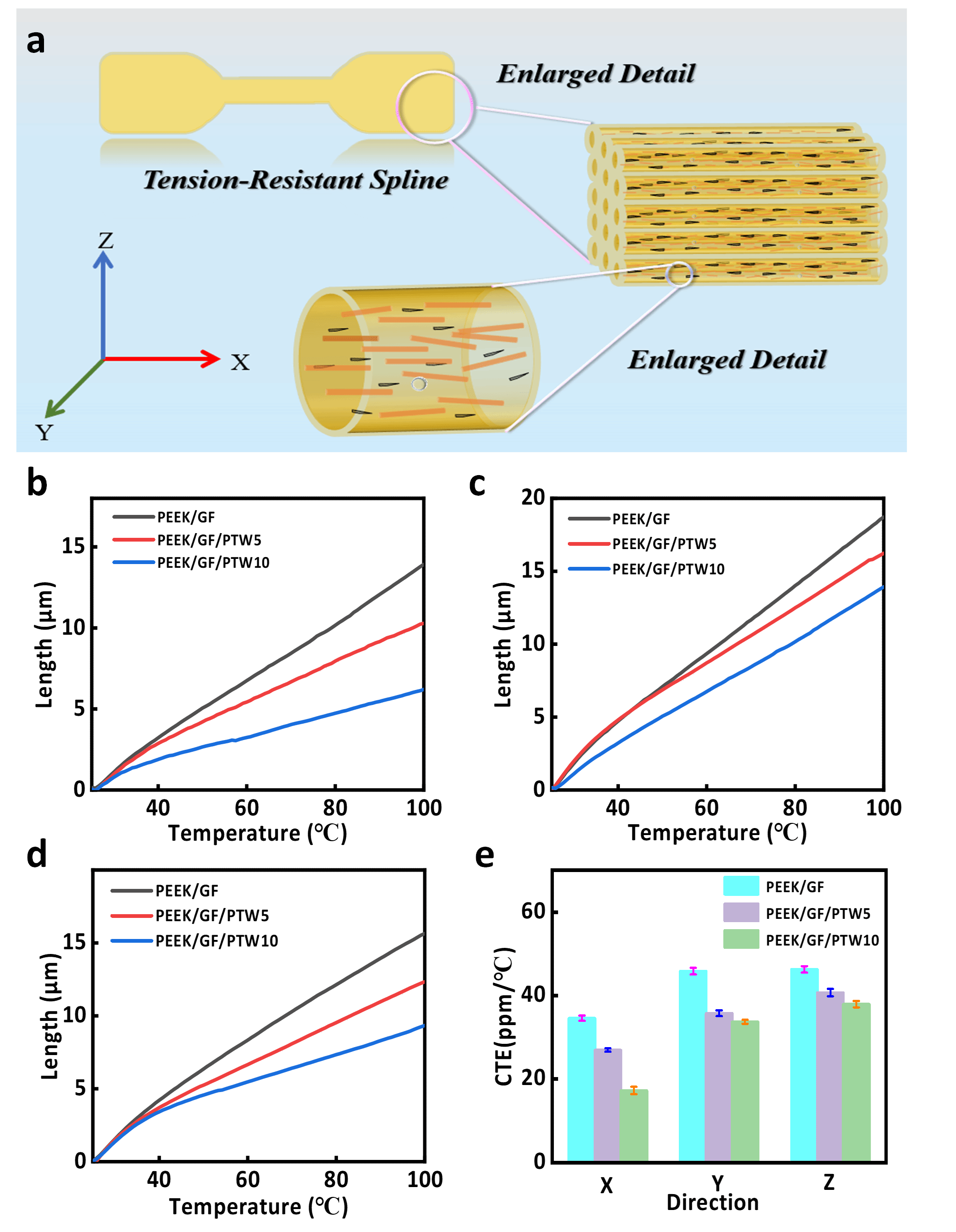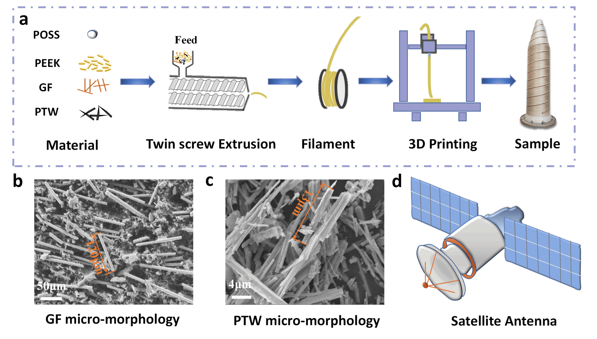 论文研究制备出一种低介电低热膨胀系数的聚醚醚酮(PEEK)复合材料。该研究有两大创新点,第一采用协同改性策略,将玻璃纤维(GF)与钛酸钾晶须(PTW)结合,在PEEK基体中构建“宏-微”双网络结构。通过熔融沉积成型(FDM)3D打印技术成功制备了低介电复合材料;第二引入中国科学院化学所的硅氮树脂,有效地改善PEEK复材的耐原子氧效果。该协同改性策略实现了力学性能、热稳定性和介电性能的均衡优化,在5G高频电子封装和航空航天热管理部件领域显示出巨大的应用潜力。