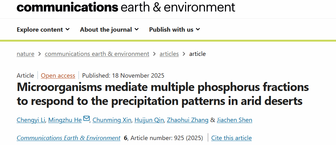 近日,我校山地重点实验室青年教师李承义博士联合中国科学院西北生态环境资源研究院沙坡头国家站何明珠研究员在地球科学领域国际顶级学术期刊《Communications Earth & Environment》(中科院一区TOP)上发表题为“Microorganisms mediate multiple phosphorus fractions to respond to the precipitation patterns in arid deserts”的研究论文。