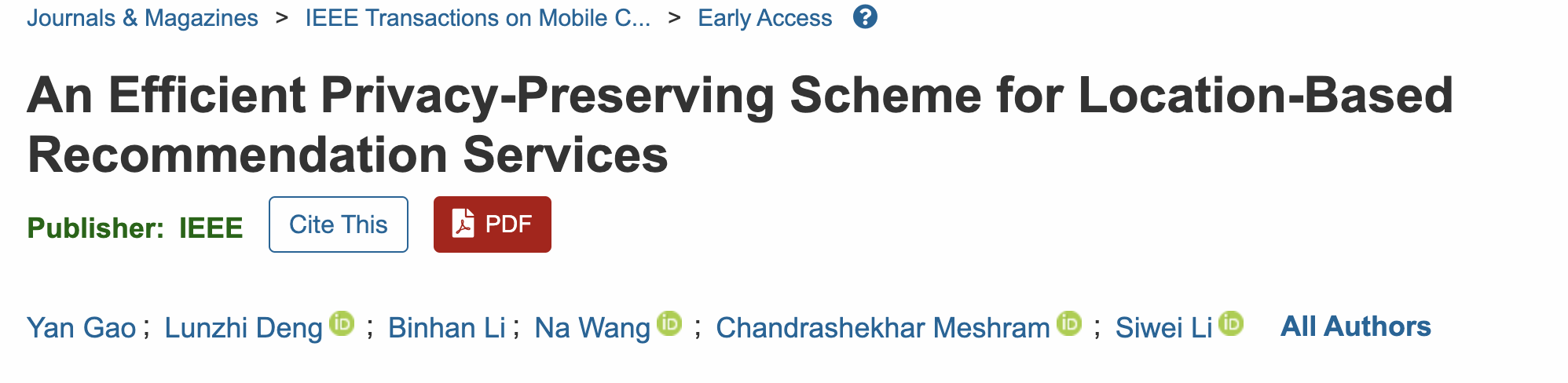 近日,我校邓伦治教授领衔的密码学团队在信息科学领域国际TOP期刊《IEEE Transactions on Mobile Computing》(中科院SCI一区,IF=9.2,CCF-A)在线发表题为“An Efficient Privacy-Preserving Scheme for Location-Based Recommendation Services”的研究论文。
