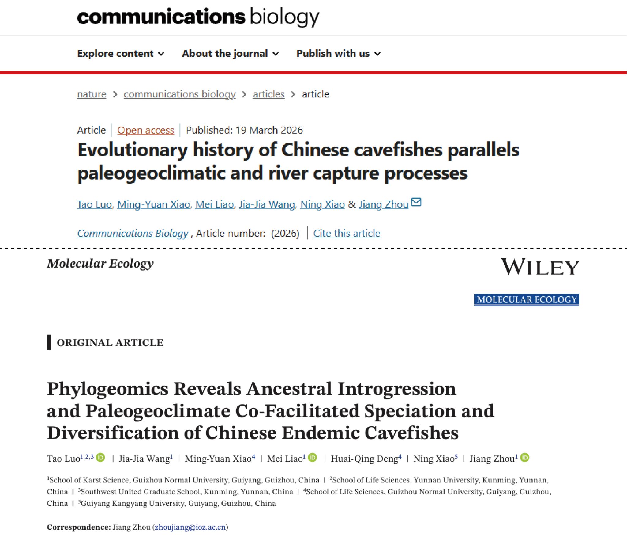 近日,我校喀斯特研究院周江教授团队在Nature旗下期刊《Communications Biology》和进化生物学领域权威期刊《Molecular Ecology》分别在线发表了题为“Evolutionary history of Chinese cavefishes parallels paleogeoclimatic and river capture processes”和“Phylogeomics Reveals Ancestral Introgression and Paleogeoclimate Co-Facilitated Speciation and Diversification of Chinese Endemic Cavefishes”的研究论文。