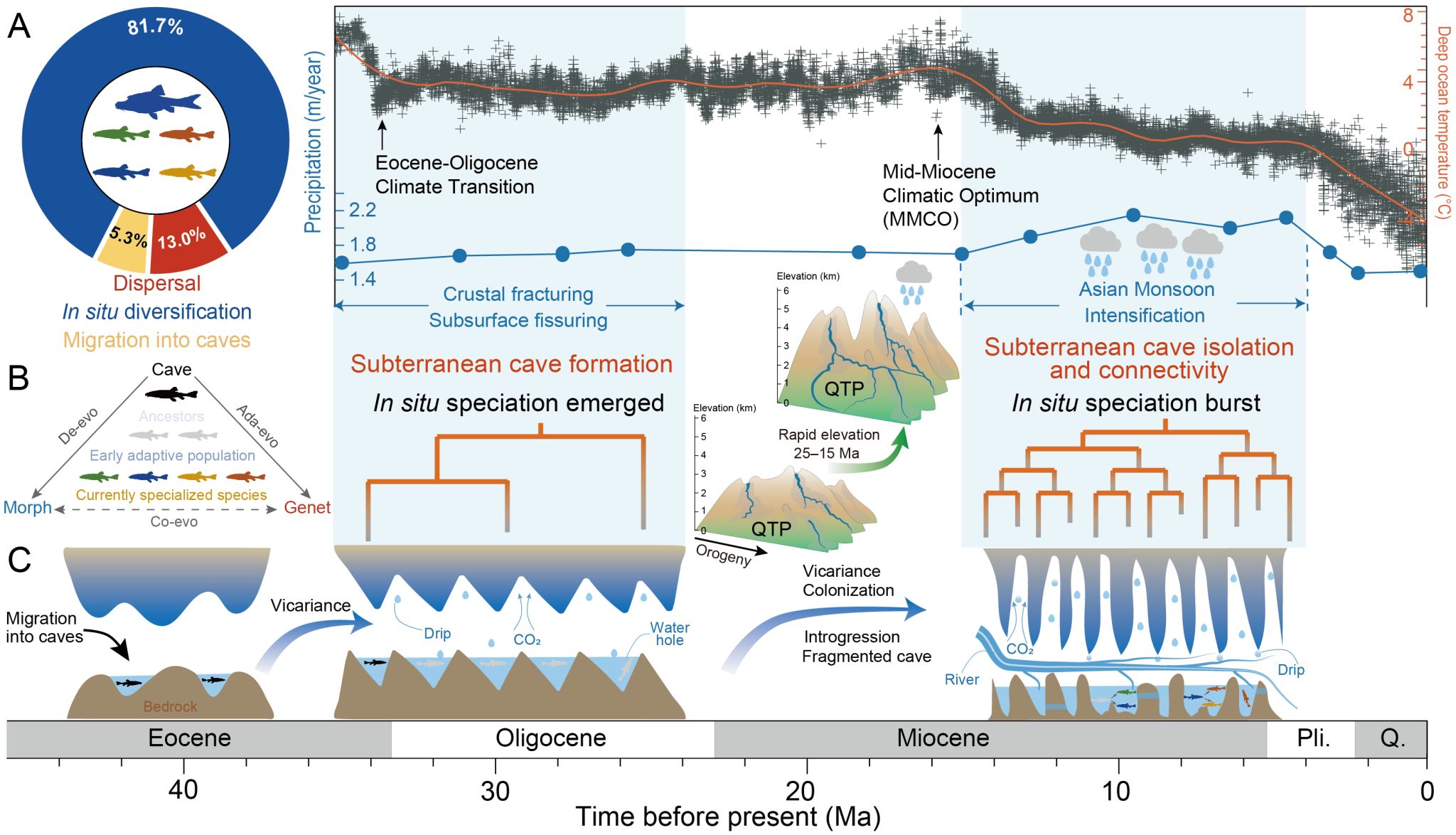 第一项研究揭示了中国洞穴鱼类的起源与多样化历史——淡水鱼类约在4400万年前开始定殖于洞穴,中国洞穴鱼类物种形成以原位多样化为主导,始于~43.20百万年(Ma),在~35Ma和18Ma前显著加速,并于8.3Ma、2.5Ma和1.5Ma达到峰值。不同流域单元呈现出相异的多样化格局。珠江与长江流域之间的扩散始于~24.1Ma,在约21.0Ma、13.0Ma和9.6 Ma明显增强,并在~13Ma、5Ma和2Ma达到峰值。研究推测,中国西南地区的水系自始新世晚期至更新世早期经历了阶段性发育,珠江与长江流域之间的连通性于渐新世晚期(~26 Ma)建立。中国洞穴鱼类的起源与多样化,与晚始新世以来构造运动及季风驱动下的气候变迁所塑造的喀斯特地貌演化密切相关。这些认识对于在当前气候变化背景下制定针对这些独特栖息地的保护策略具有重要意义。