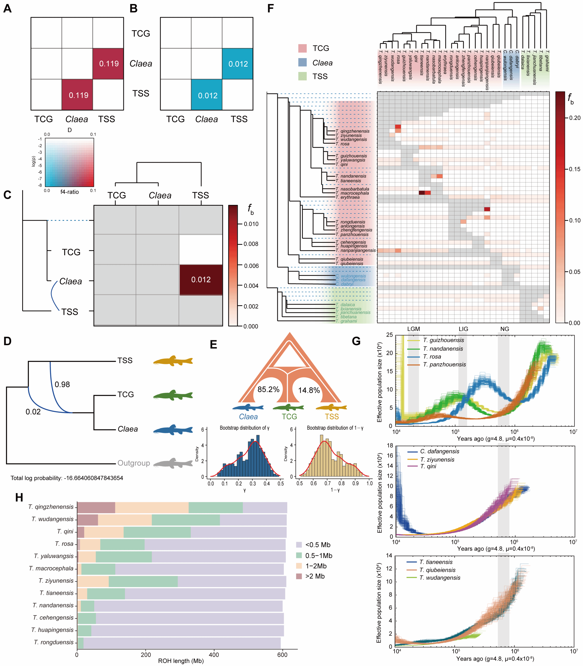 第二项研究解析了穴居高原鳅的演化历史与适应性遗传特征。高原鳅属(Triplophysa sensu lato)中的洞穴类群是中国西南喀斯特地区特有的洞穴鱼类,表现出高度的多样性和快速演化特征,是喀斯特地貌演化过程中物种快速形成的典型潜在案例。研究团队通过对24个物种进行全基因组重测序分析,探讨了该洞穴类群多样化和快速辐射的演化历史。通过不同方法重建系统发育关系,并量化基因渐渗程度,结果共同证实了该洞穴类群与山鳅属之间以及其内部物种之间存在广泛的历史基因流。在该类群普遍存在系统发育冲突的背景下,种间渐渗的作用远大于不完全谱系分选。渐渗水平最高的基因组区域富集在与洞穴生活适应表型相关的生物学过程,如昼夜节律行为、表型可塑性、脂质代谢、氧气运输和繁殖等。群体历史动态重建进一步表明,古地理气候因素与该类群独特的遗传属性共同作用,可能促进了奠基者效应、近交以及随后有效种群规模的下降,并形成了两种不同的种群演化轨迹。此外,该研究表明,穴居高原鳅的起源与物种形成过程与青藏高原的快速隆升及伴随的气候转型密切相关,并识别出谱系分化的三个阶段,其特征为构造—气候相互作用驱动的交替加速与减缓,这些变化与亚洲主要的造山事件和季风周期同步发生。