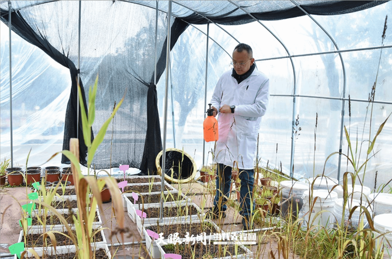 贵州师范大学黎阳教授正在实验大棚做在赤泥“土壤化”实验