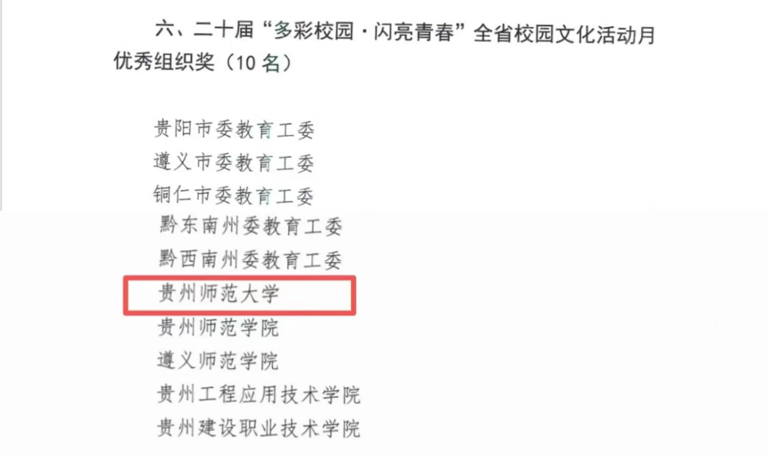 近日,由中共贵州省委教育工委、贵州省教育厅主办的第二十届“多彩校园·闪亮青春”全省校园文化活动月成果展示暨颁奖仪式在遵义师范学院举行。