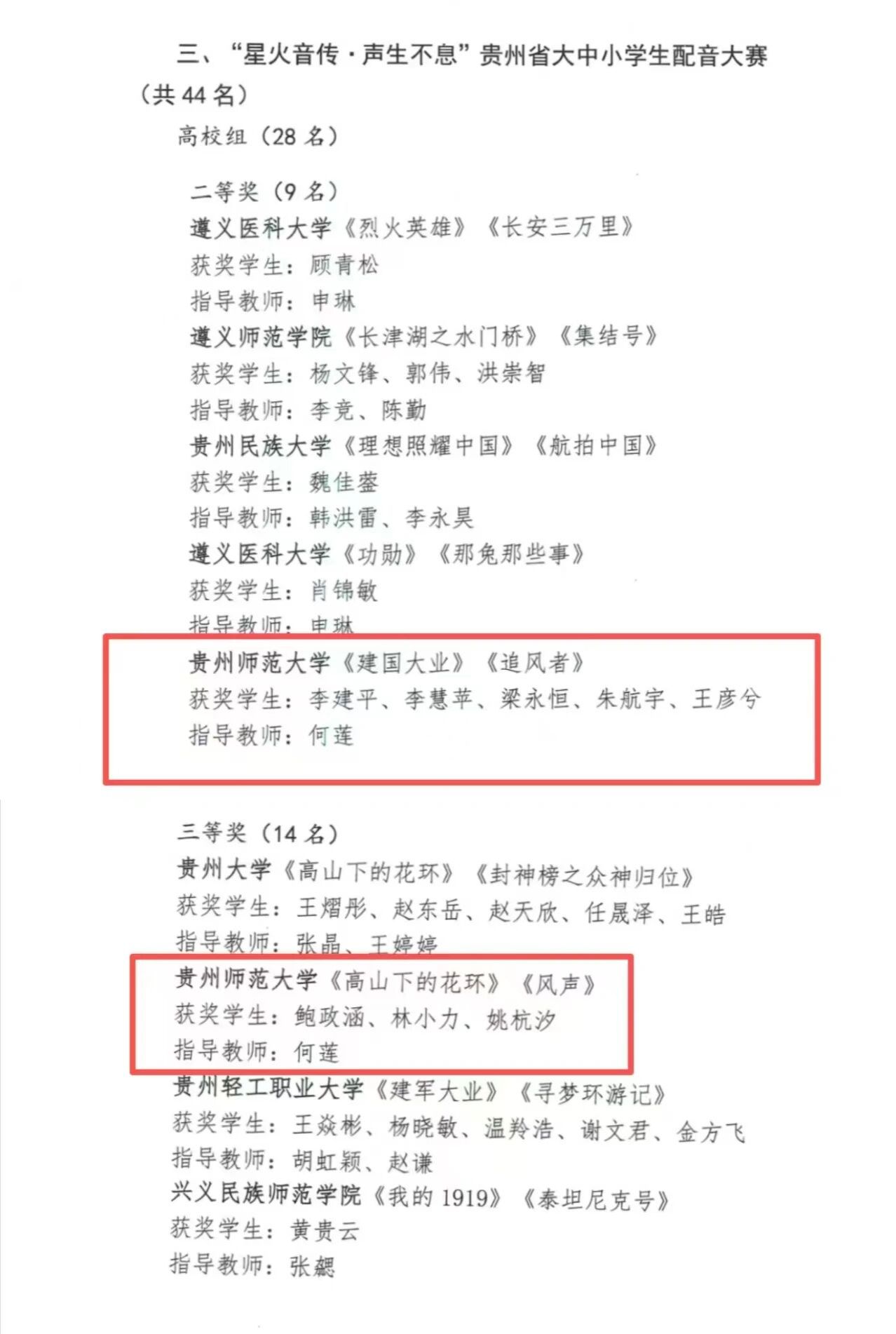 本届校园文化活动月共产生206个奖项,现场为“赤子之声·青春共鸣”全省大中小学联唱快闪大赛、“黔心向党·红剧薪传”贵州省高校红色剧本杀创作大赛、“星火音传·声生不息”贵州省大中小学生配音大赛、“赓续血脉·薪火相传”全省高校舞台剧大赛、“多彩创意·潮赋新生”全省大学生文化创新设计大赛获奖代表和“优秀组织奖”获奖单位颁奖。其中,我校荣获第二十届“多彩校园·闪亮青春”全省校园文化活动月优秀组织奖,我校师生获一等奖2项、二等奖4项、三等奖3项。