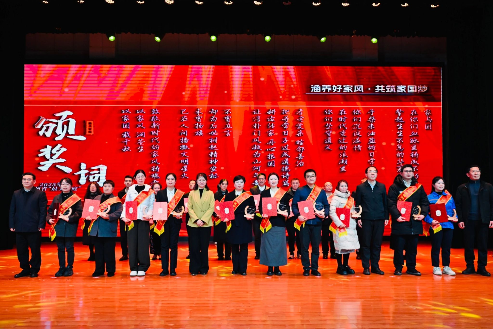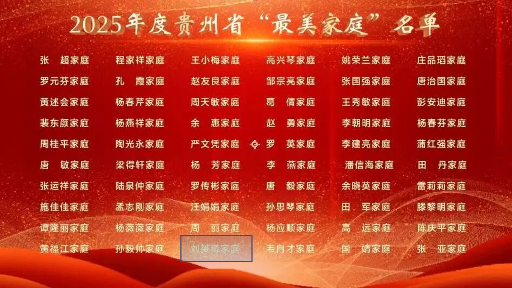 12月17日,2025年度贵州省“最美家庭”发布暨“身边的好家风”分享活动在贵州师范学院举行。本次活动由中共贵州省委宣传部、贵州省妇女联合会主办,贵州师范学院协办,以“涵养好家风·共筑家园梦”为主题,现场揭晓60户2025年度贵州省“最美家庭”名单,我校档案馆教师刘赟博家庭成功入选。