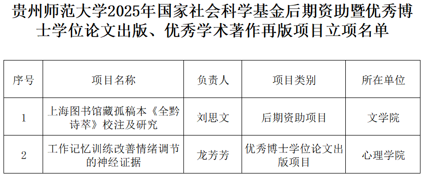 12月23日,全国哲学社会科学工作办公室公布了2025年国家社会科学基金后期资助暨优秀博士学位论文出版、优秀学术著作再版项目立项名单,我校共有2项项目(后期资助项目1项,优秀博士学位论文出版项目1项)成功立项,其中优秀博士学位论文出版是我校首次、也是本年度贵州省唯一获批立项的项目。
