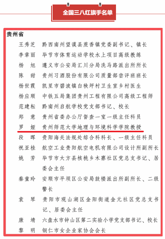 近日,2025年度全国三八红旗手(集体)及全国巾帼文明岗名单公布,贵州师范大学地理与环境科学学院(喀斯特研究院)教授罗娅凭借在科研创新、教育育人及社会服务领域的突出贡献光荣入选,荣获“全国三八红旗手”荣誉称号,该称号是全国妇联授予我国优秀女性(优秀女性群体)的最高荣誉。