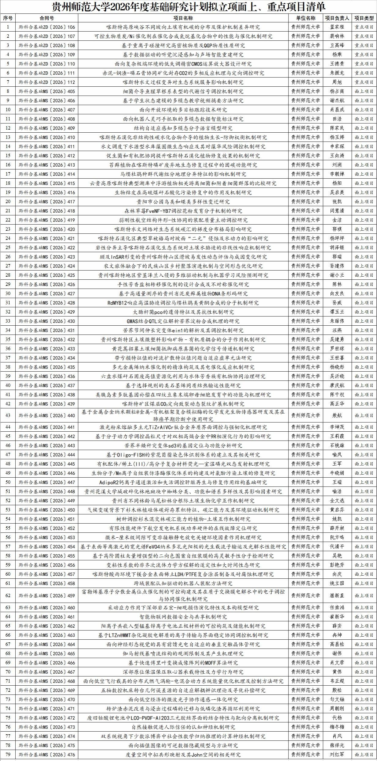 近日,贵州省科技厅公布《2026年度贵州省基础研究计划(自然科学)面上项目和重点项目拟立项项目名单》,我校共获批79项(其中,面上项目72项,重点项目7项),刷新我校贵州省基础研究计划(自然科学)项目立项历史最好成绩,充分彰显了我校基础研究能力与科研创新水平的持续提升,是学校高度重视基础研究、大力培育科研团队、不断优化科研生态的重要成果。